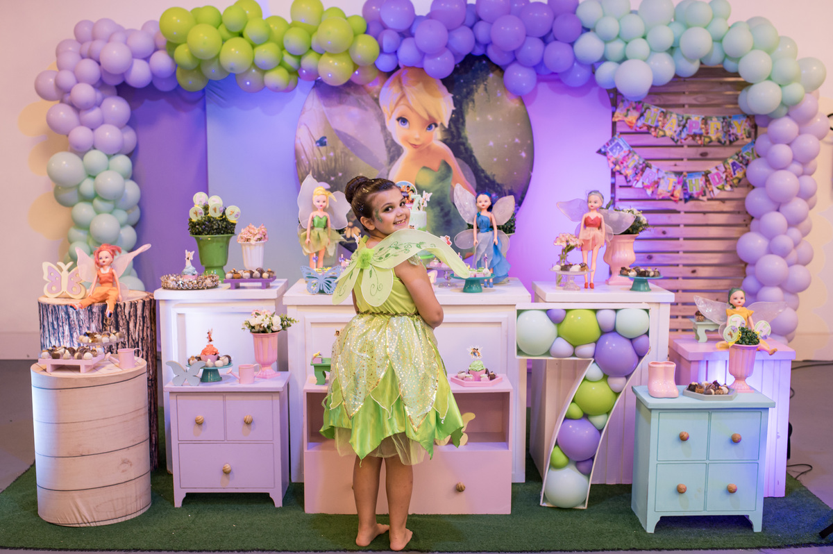 E ela já chegou toda faceira na festa, vestida de Tinker Bell, que era o tema da decoração! Até asinhas e varinha mágica ela tinha, mas logo teve que deixá-las de lado pra poder brincar!