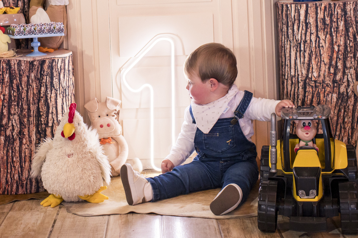 Festa de aniversário infantil - criança na frente da decoração de fazendinha