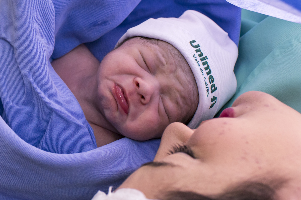 Documental de parto/cesária no hospital Unimed Vale do Caí, beicinho do bebê, pertinho da mãe