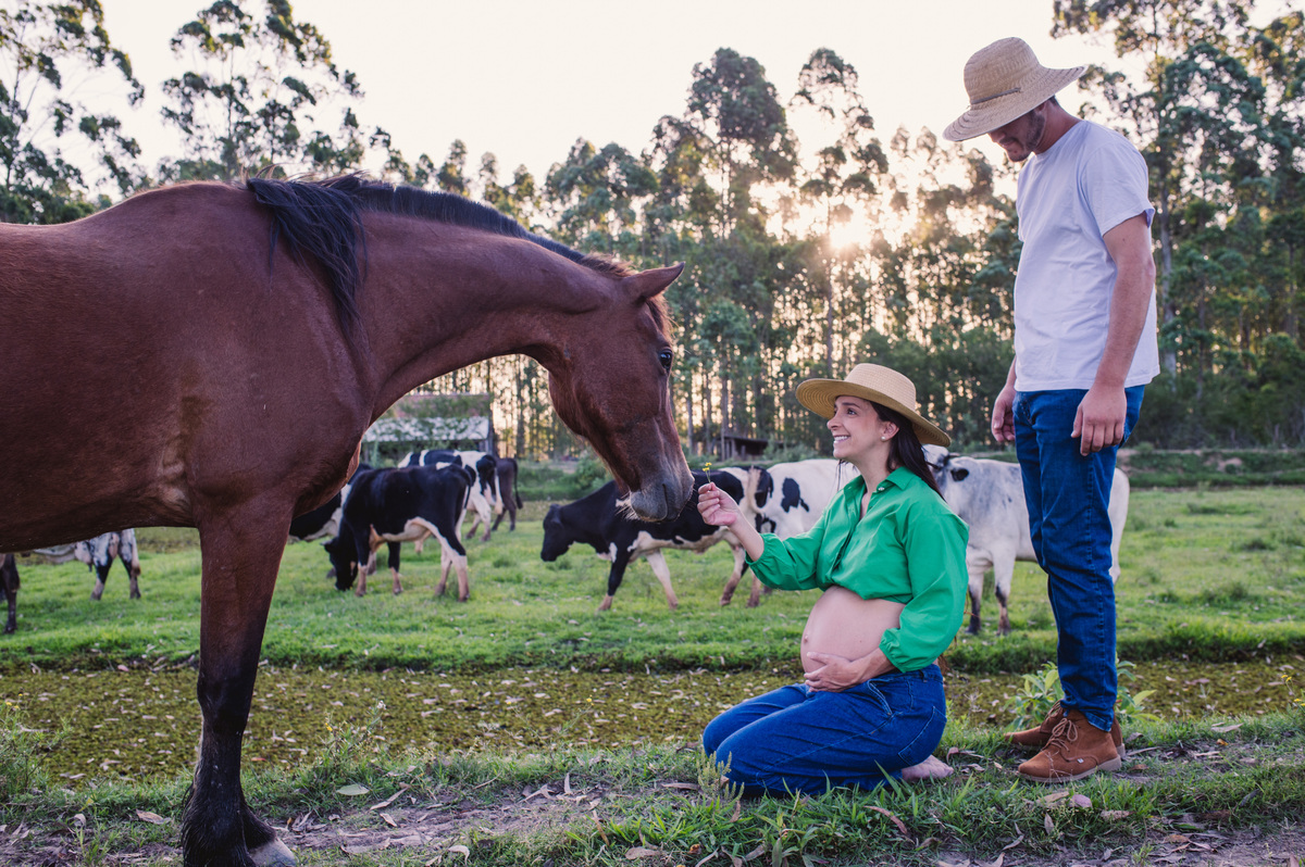 Ensaio gestante de gêmeos no interior de Triunfo, com vacas, bois e égua - Fotógrafa Claudia Wallauer