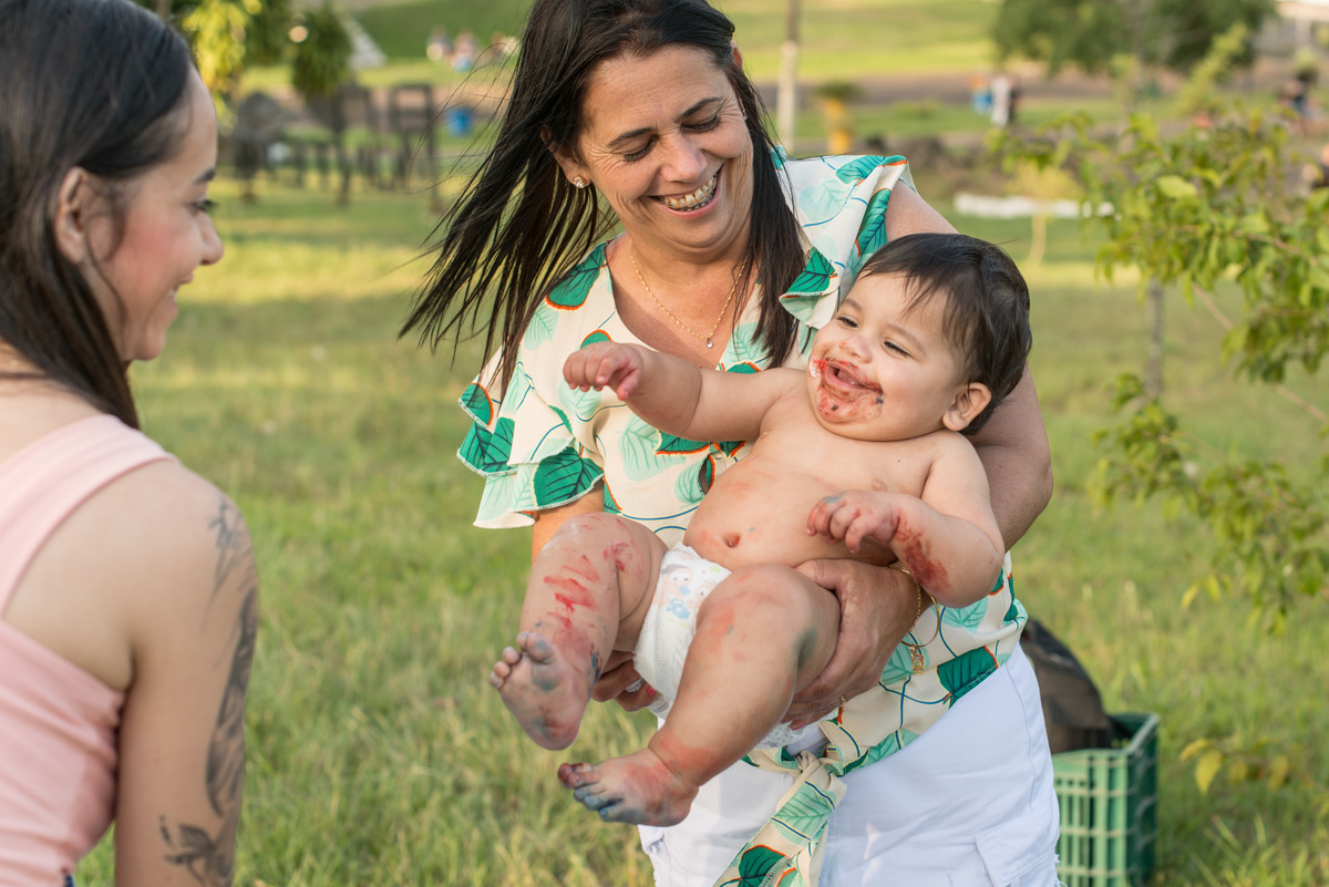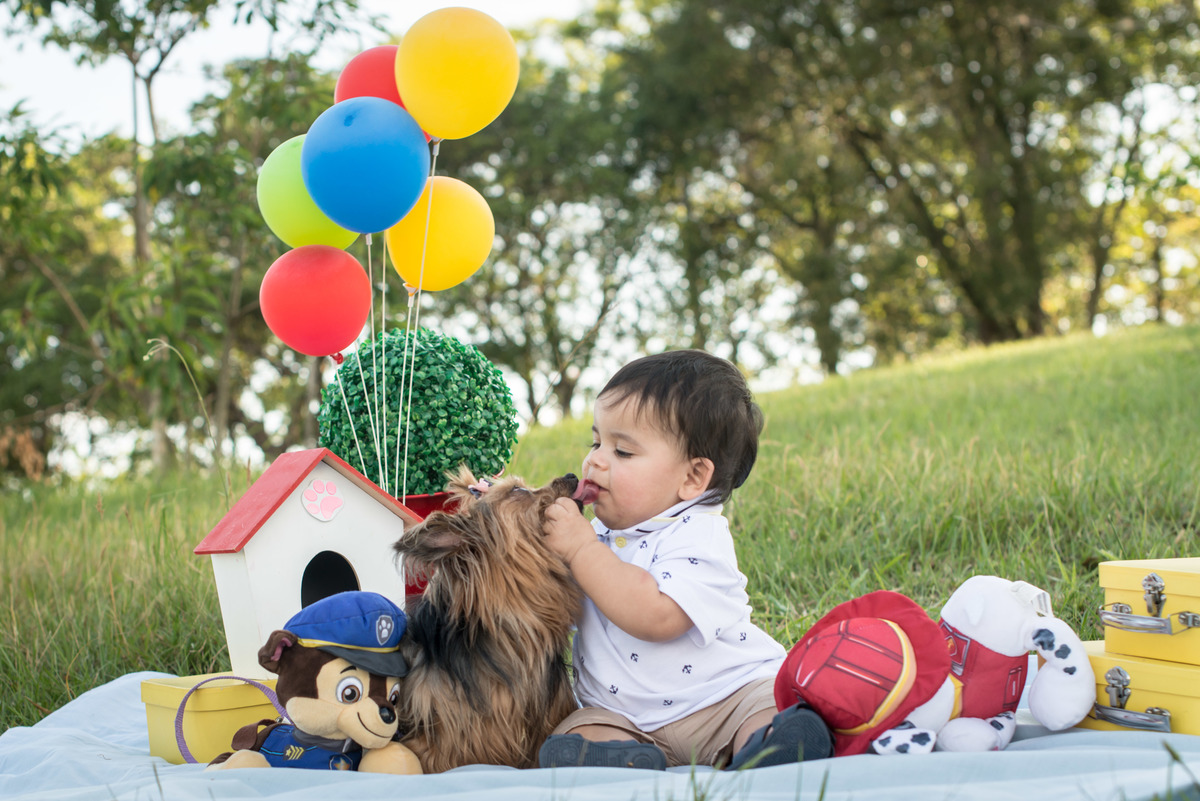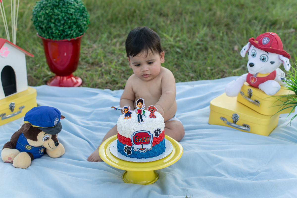 Coisa se boa se lambuzar de doce! Primeiro tiramos fotos "normais", todo arrumadinho. O tema era da Patrulha Canina (obrigada ArtFestas, pelo cenário) e até o cãozinho da vovó participou das fotos, roubando um "lambeijo". No começo o Enzo ficou meio desconfiado, mas depois encontrou os enfeites do bolo, sentiu o docinho do recheio e foi só aproveitando o momento! E no final ainda teve uns amassos da vovó!
