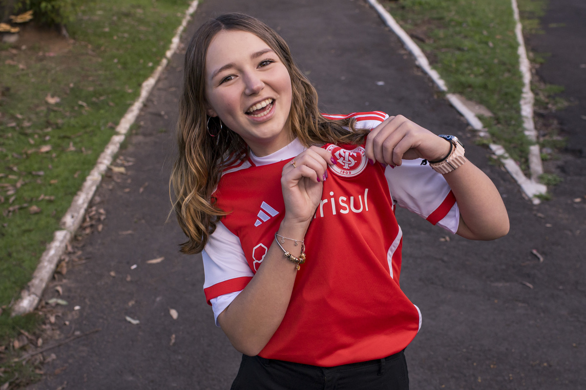 Ensaio pré 15 no parque centenário em Montenegro - foto da debutante com a camiseta do internacional