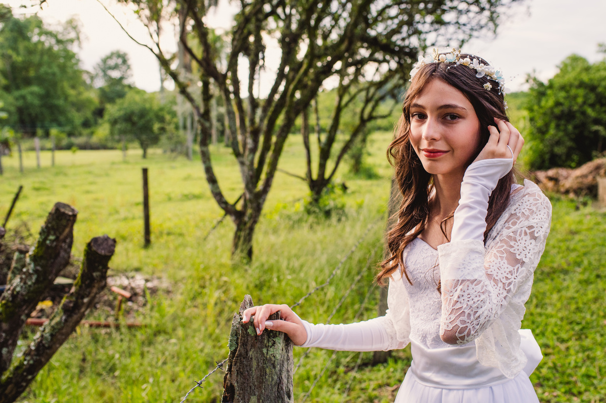 Foto da confirmanda com vestido branco na Comunidade Evangélica de Campo do Meio